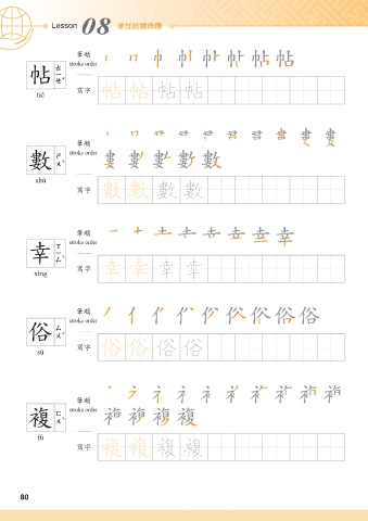 08 Lesson 參加結婚典禮 അන stroke order ֭ 帖 tiě ᄳο ֭ ֭ 帖 帖 അන ᅰ 數 stroke order shù ᄳο ᅰ ᅰ 數 數 അන stroke order ֱ 幸 xìng ᄳο ֱ ֱ 幸 幸 അන stroke order ڳ 俗 sú ᄳο ڳ ڳ 俗 俗 അන ል 副 stroke order fù ᄳο ል ል 複 複 80