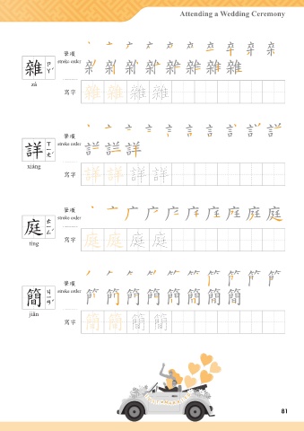 Attending a Wedding Ceremony അන ᕏ 雜 stroke order zá ᄳο ᕏ ᕏ 雜 雜 അන ༉ 祥 stroke order xiáng ᄳο ༉ ༉ 詳 詳 അන stroke order ࢬ 停 tíng ᄳο ࢬ ࢬ 庭 庭 അන ᔊ 簡 stroke order jiǎn ᄳο ᔊ ᔊ 簡 簡 81