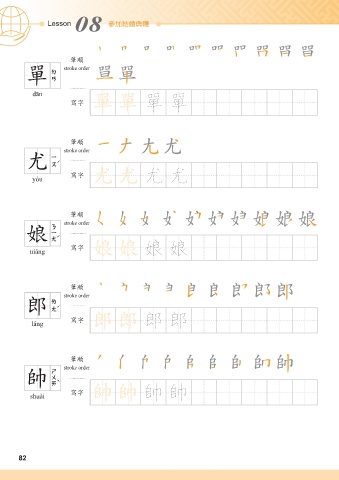 08 Lesson 參加結婚典禮 അන ఊ 單 stroke order dān ᄳο ఊ ఊ 單 單 അන stroke order ˈ 由 yóu ᄳο ˈ ˈ 尤 尤 അන stroke order ࢅ 娘 niáng ᄳο ࢅ ࢅ 娘 娘 അන stroke order ࠛ 郎 láng ᄳο ࠛ ࠛ 郎 郎 അන stroke order 率 shuài ᄳο 帥 帥 82
