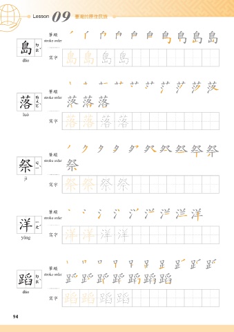 09 Lesson 臺灣的原住民族 അන stroke order ࢥ 島 dǎo ᄳο ࢥ ࢥ 島 島 അන ໝ 落 stroke order luò ᄳο ໝ ໝ 落 落 അන ୄ 祭 stroke order jì ᄳο ୄ ୄ 祭 祭 അන stroke order ݱ 洋 yáng ᄳο ݱ ݱ 洋 洋 അන ᒋ 蹈 stroke order dào ᄳο ᒋ ᒋ 蹈 蹈 94