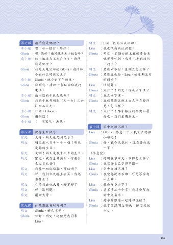 Gloria : 喂,您好!请问林美美小姐在吗? Gloria : 明文,星期六晚上我们要去美