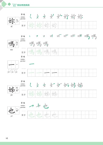 Pelajaran 我有兩個弟弟 02 筆順 urutan 妳 guratan nǐ 寫字 妳妳 妳 妳 筆順 urutan guratan 嗎 ma 寫字 嗎嗎 嗎 嗎 筆順 urutan guratan 一 一 ˊ ˋ ㄧ / ㄧ / ㄧ yī / yí / yì 寫字 一一 一一 筆順 urutan guratan 姊 jiě 寫字 姊姊 姊 姊 筆順 urutan guratan 也 yě 寫字 也也 也 也 12