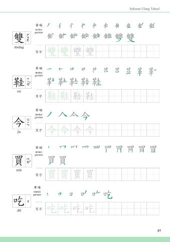 Selamat Ulang Tahun! 筆順 urutan guratan 雙 shuāng 寫字 雙雙 雙 雙 筆順 urutan guratan 鞋 xié 鞋鞋 鞋 鞋 寫字 筆順 urutan 今 guratan jīn 寫字 今今 今 今 筆順 urutan guratan 買 mǎi 寫字 買買 買 買 筆順 urutan guratan 吃 chī 寫字 吃吃 吃 吃 57