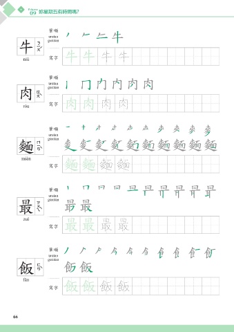 Pelajaran 妳星期五有時間嗎? 09 筆順 urutan guratan 牛 niú 寫字 牛牛 牛 牛 筆順 urutan 肉 guratan ròu 寫字 肉肉 肉 肉 筆順 urutan guratan 麵 miàn 寫字 麵麵 麵 麵 筆順 urutan guratan 最 zuì 寫字 最最 最 最 筆順 urutan guratan 飯 fàn 飯飯 飯 飯 寫字 66