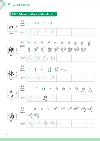 Pelajaran 學華語難不難? 10 VIII. Menulis Aksara Mandarin 筆順 urutan guratan 中 zhōng 寫字 中中 中 中 筆順 urutan guratan 難 nán 難難 難 難 寫字 筆順 urutan guratan 休 xiū 寫字 休休 休 休 筆順 urutan guratan 息 xí 寫字 息息 息 息 筆順 urutan guratan 喝 hē 寫字 喝喝 喝 喝 72