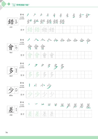 Pelajaran 學華語難不難? 10 筆順 urutan guratan 錯 cuò 錯錯 錯 錯 寫字 筆順 urutan guratan 會 huì 會會 會 會 寫字 筆順 urutan guratan 多 duō 寫字 多多 多 多 筆順 urutan guratan 少 shǎo 寫字 少少 少 少 筆順 urutan guratan 差 chā 寫字 差差 差 差 74