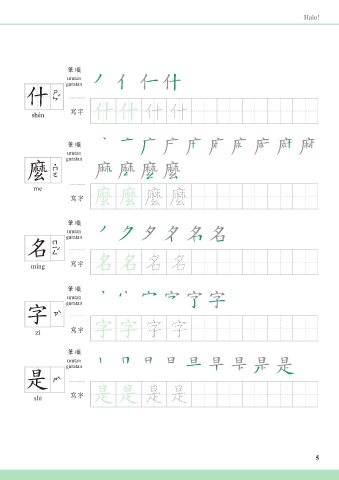 Halo! 筆順 urutan guratan 什 shén 寫字 什什 什 什 筆順 urutan guratan 麼 me 寫字 麼麼 麼 麼 筆順 urutan guratan 名 míng 寫字 名名 名 名 筆順 urutan guratan 字 zì 寫字 字字 字 字 筆順 urutan guratan 是 shì 寫字 是是 是 是 5