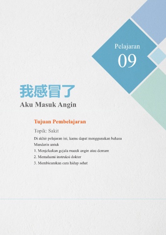 Pelajaran 09 我感冒了 Aku Masuk Angin Tujuan Pembelajaran Topik: Sakit Di akhir pelajaran ini, kamu dapat menggunakan bahasa Mandarin untuk 1. Menjelaskan gejala masuk angin atau demam 2. Memahami instruksi dokter 3. Membicarakan cara hidup sehat