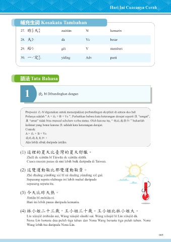 Preposisi 比 bǐ digunakan untuk menunjukkan perbandingan eksplisit di antara dua hal.