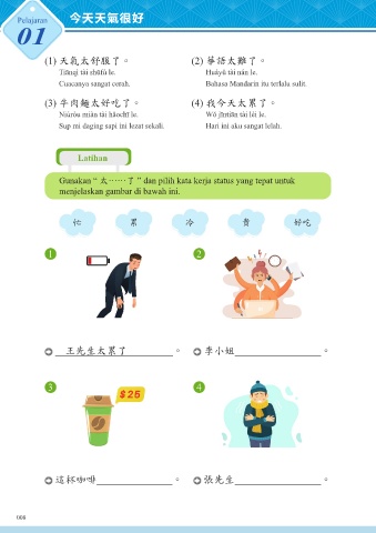 Gunakan “ 太……了 ” dan pilih kata kerja status yang tepat untuk
