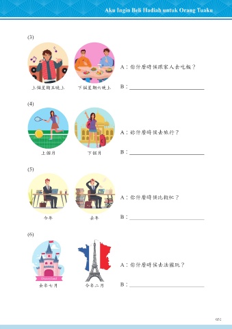 Aku Ingin Beli Hadiah untuk Orang Tuaku (3) A: 你什麼時候跟家人去吃飯? 上個星期五晚上 下個星期六晚上 B: (4) A: 妳什麼時候去旅行? 上個月 下個月 B: (5) A:你什麼時候比較忙? 今年 去年 B: (6) A:你什麼時候去法國玩? DisneylandDisneyland 去年七月 今年二月 B: 031