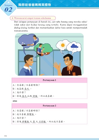 B: 因為 春天 比較 舒服 ,所以我喜歡。