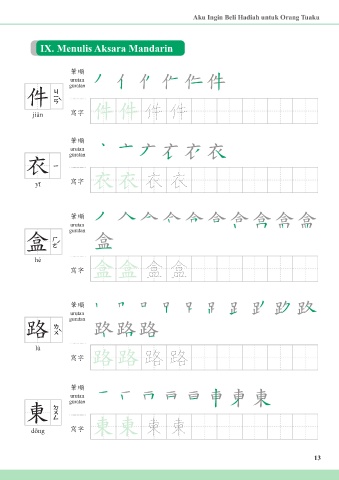 Aku Ingin Beli Hadiah untuk Orang Tuaku IX. Menulis Aksara Mandarin 筆順 urutan guratan 件 jiàn 寫字 件件 件 件 筆順 urutan guratan 衣 yī 寫字 衣衣 衣 衣 筆順 urutan guratan 盒 hé 盒盒 盒 盒 寫字 筆順 urutan guratan 路 lù 路路 路 路 寫字 筆順 urutan guratan 東 dōng 寫字 東東 東 東 13
