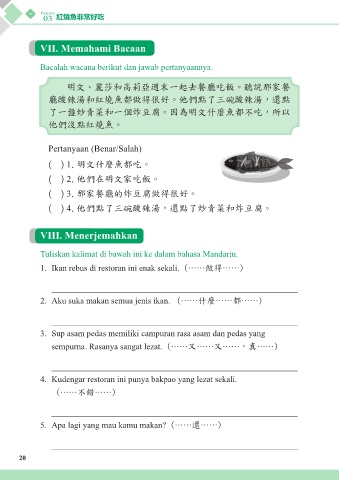 1. Ikan rebus di restoran ini enak sekali.(……做得……)