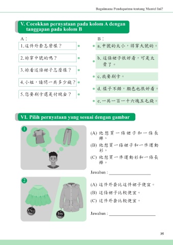 1. 這件外套怎麼樣? a. 中號的太小,得穿大號的。