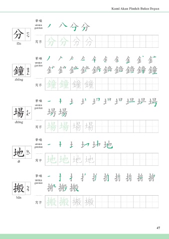 Kami Akan Pindah Bulan Depan 筆順 urutan guratan 分 fēn 寫字 分分 分 分 筆順 urutan guratan 鐘 zhōng 鐘鐘 鐘 鐘 寫字 筆順 urutan 場 guratan chǎng 寫字 場場 場 場 筆順 urutan guratan 地 dì 寫字 地地 地 地 筆順 urutan guratan 搬 bān 搬搬 搬 搬 寫字 47