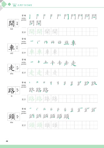 Pelajaran 06 我們下個月搬家 筆順 urutan guratan 開 kāi 寫字 開開 開 開 筆順 urutan guratan 車 chē 寫字 車車 車 車 筆順 urutan guratan 走 zǒu 寫字 走走 走 走 筆順 urutan guratan 路 lù 寫字 路路 路 路 筆順 urutan guratan 頭 tóu 頭頭 頭 頭 寫字 48 48