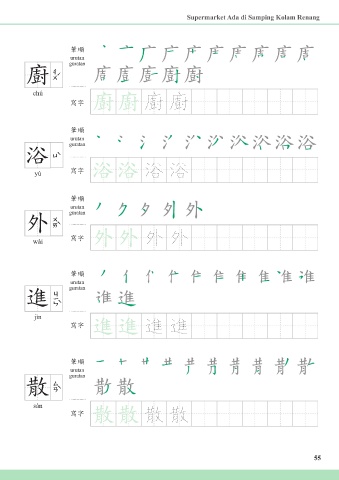 Supermarket Ada di Samping Kolam Renang 筆順 urutan guratan 廚 chú 寫字 廚廚 廚 廚 筆順 urutan guratan 浴 yù 寫字 浴浴 浴 浴 筆順 urutan guratan 外 wài 寫字 外外 外 外 筆順 urutan guratan 進 jìn 進進 寫字 進 進 筆順 urutan 散 guratan sàn 寫字 散散 散 散 55