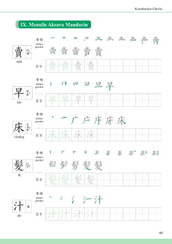Keseharian Gloria IX. Menulis Aksara Mandarin 筆順 urutan guratan 賣 mài 寫字 賣賣 賣 賣 筆順 urutan guratan 早 zǎo 寫字 早早 早 早 筆順 urutan guratan 床 chuáng 寫字 床床 床 床 筆順 urutan guratan 髮 fǎ 寫字 髮髮 髮 髮 筆順 urutan guratan 汁 zhī 寫字 汁汁 汁 汁 61