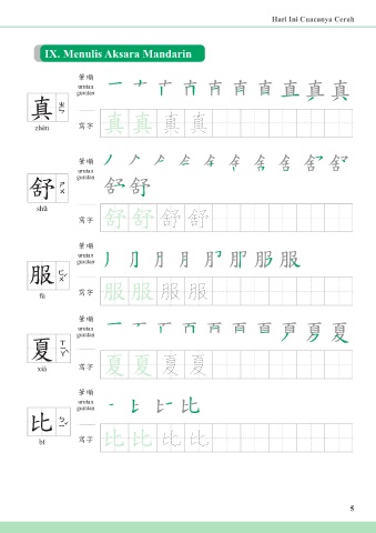 Hari Ini Cuacanya Cerah IX. Menulis Aksara Mandarin 筆順 urutan guratan 真 zhēn 寫字 真真 真 真 筆順 urutan guratan 舒 shū 寫字 舒舒 舒 舒 筆順 urutan guratan 服 fú 寫字 服服 服 服 筆順 urutan guratan 夏 xià 寫字 夏夏 夏 夏 筆順 urutan guratan 比 bǐ 寫字 比比 比 比 5