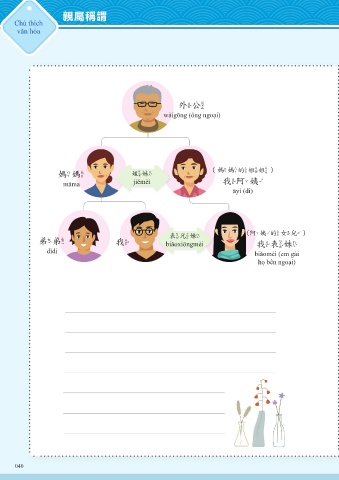 親屬稱謂 Chú thích văn hóa 外公 wàigōng (ông ngoại) 媽媽 姐妹 (媽媽的姐姐) māma jiěmèi 我阿姨 āyí (dì) 表兄妹 (阿姨的女兒) 弟弟 我 biǎoxiōngmèi 我表妹 dìdi biǎomèi (em gái họ bên ngoại) 040