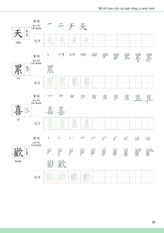 Bố tôi làm việc tại một công ty máy tính 筆順 quy tắc bút thuận 天 tiān 寫字 天天 天 天 筆順 quy tắc bút thuận 累 lèi 寫字 累累 累 累 筆順 quy tắc bút thuận 喜 xǐ 寫字 喜喜 喜 喜 筆順 quy tắc bút thuận 歡 huān 歡歡 歡 歡 寫字 25