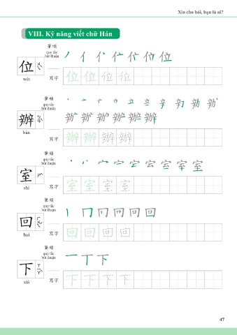 Xin cho hỏi, bạn là ai? VIII. Kỹ năng viết chữ Hán 筆順 quy tắc bút thuận 位 wèi 寫字 位位 位 位 筆順 quy tắc bút thuận 辦 bàn 寫字 辦辦 辦 辦 筆順 quy tắc bút thuận 室 shì 寫字 室室 室 室 筆順 quy tắc bút thuận 回 huí 寫字 回回 回 回 筆順 quy tắc bút thuận 下 xià 寫字 下下 下 下 47