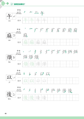 Bài học 07 請問您是哪位? 筆順 quy tắc bút thuận 午 wǔ 寫字 午午 午 午 筆順 quy tắc bút thuận 麻 má 寫字 麻麻 麻 麻 筆順 quy tắc bút thuận 煩 fán 寫字 煩煩 煩 煩 筆順 quy tắc bút thuận 以 寫字 以以 以 以 yǐ 筆順 quy tắc bút thuận 後 hòu 寫字 後後 後 後 48