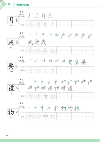Bài học 08 祝你生日快樂 筆順 quy tắc bút thuận 月 yuè 寫字 月月 月 月 筆順 quy tắc bút thuận 歲 suì 歲歲 歲 歲 寫字 筆順 quy tắc bút thuận 要 yào 寫字 要要 要 要 筆順 quy tắc bút thuận 禮 lǐ 寫字 禮禮 禮 禮 筆順 quy tắc bút thuận 物 wù 寫字 物物 物 物 56