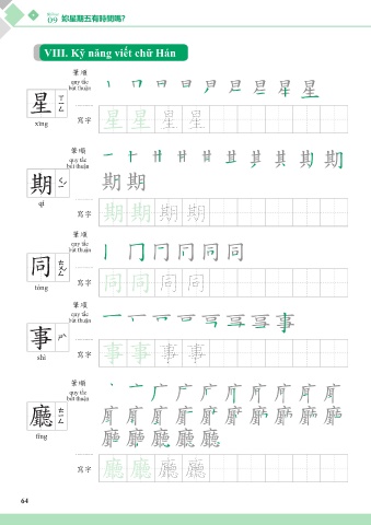 Bài học 09 妳星期五有時間嗎? VIII. Kỹ năng viết chữ Hán 筆順 quy tắc bút thuận 星 xīng 寫字 星星 星 星 筆順 quy tắc bút thuận 期 qí 寫字 期期 期 期 筆順 quy tắc bút thuận 同 tóng 寫字 同同 同 同 筆順 quy tắc bút thuận 事 shì 寫字 事事 事 事 筆順 quy tắc bút thuận 廳 tīng 廳廳 廳 廳 寫字 64