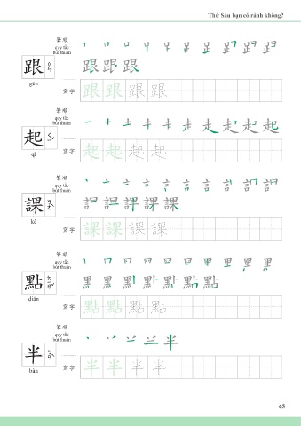 Thứ Sáu bạn có rảnh không? 筆順 quy tắc bút thuận 跟 gēn 寫字 跟跟 跟 跟 筆順 quy tắc bút thuận 起 qǐ 寫字 起起 起 起 筆順 quy tắc bút thuận 課 kè 寫字 課課 課 課 筆順 quy tắc bút thuận 點 diǎn 寫字 點點 點 點 筆順 quy tắc bút thuận 半 bàn 寫字 半半 半 半 65