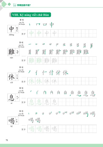 Bài học 10 學華語難不難? VIII. Kỹ năng viết chữ Hán 筆順 quy tắc bút thuận 中 zhōng 寫字 中中 中 中 筆順 quy tắc bút thuận 難 nán 難難 難 難 寫字 筆順 quy tắc bút thuận 休 xiū 寫字 休休 休 休 筆順 quy tắc bút thuận 息 xí 寫字 息息 息 息 筆順 quy tắc bút thuận 喝 hē 寫字 喝喝 喝 喝 72