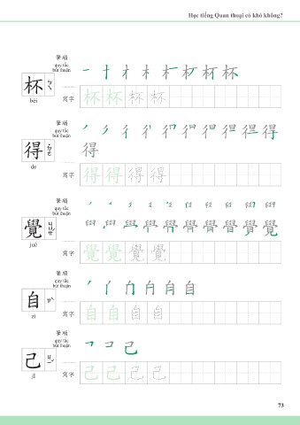Học tiếng Quan thoại có khó không? 筆順 quy tắc bút thuận 杯 bēi 寫字 杯杯 杯 杯 筆順 quy tắc bút thuận 得 de 寫字 得得 得 得 筆順 quy tắc bút thuận 覺 jué 覺覺 覺 覺 寫字 筆順 quy tắc bút thuận 自 zì 寫字 自自 自 自 筆順 quy tắc bút thuận 己 jǐ 寫字 己己 己 己 73