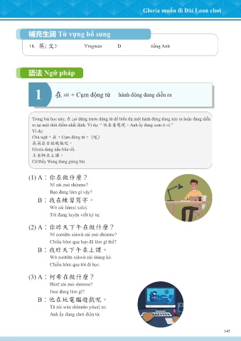 Trong bài học này, 在 zaì đứng trước động từ để biểu thị một hành động đang xảy ra hoặc đang diễn