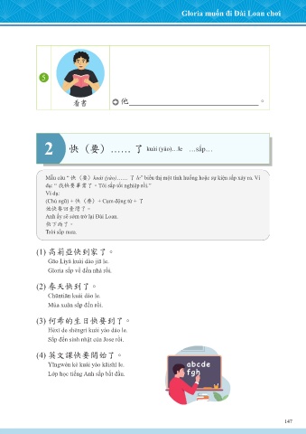 Mẫu câu “ 快(要)kuài (yào)…… 了 le” biểu thị một tình huống hoặc sự kiện sắp xảy ra. Ví