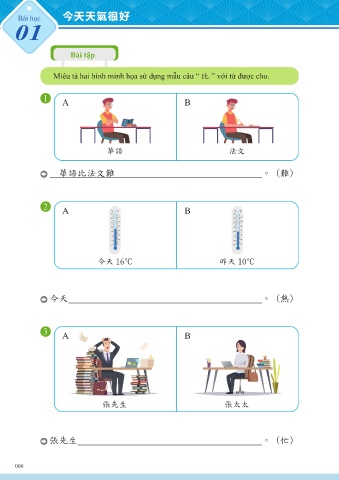 Bài học 今天天氣很好 01 Bài tập Miêu tả hai hình minh họa sử dụng mẫu câu “ 比 ” với từ được cho. 1 A B 學華語 學華語 華語 法文 華語比法文難 。(難) 2 A B 今天 16℃ 昨天 10℃ 今天 。(熱) 3 A B 張先生 張太太 張先生 。(忙) 006