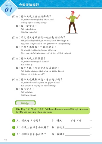 Hãy dùng “ 會 ” hoặc “ 不會 ” để hoàn thành các đọan đối thoại và sau đó