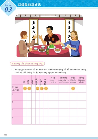 (1) Sử dụng danh sách đồ ăn dưới đây, hỏi bạn cùng lớp về đồ ăn họ thích/không