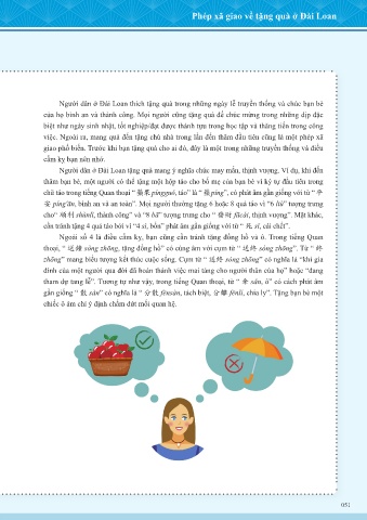 Người dân ở Đài Loan tặng quà mang ý nghĩa chúc may mắn, thịnh vượng. Ví dụ, khi đến