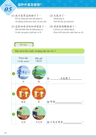 (1) 我不想買這條裙子了。 (2) 天氣冷了。