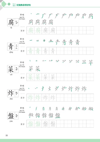 Bài học 03 紅燒魚非常好吃 筆順 quy tắc bút thuận 腐 fǔ 寫字 腐腐 腐 腐 筆順 quy tắc bút thuận 青 qīng 寫字 青青 青 青 筆順 quy tắc bút thuận 菜 cài 寫字 菜菜 菜 菜 筆順 quy tắc bút thuận 炸 zhá 寫字 炸炸 炸 炸 筆順 quy tắc bút thuận 盤 pán 盤盤 盤 盤 寫字 22