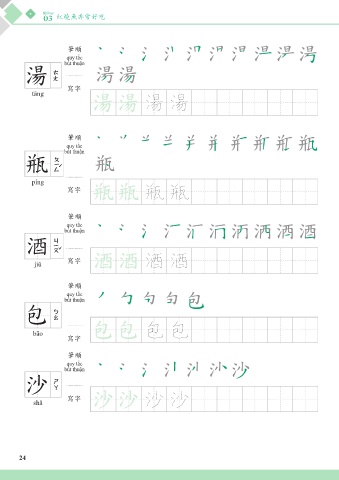 Bài học 03 紅燒魚非常好吃 筆順 quy tắc bút thuận 湯 tāng 寫字 湯湯 湯 湯 筆順 quy tắc bút thuận 瓶 píng 瓶瓶 寫字 瓶 瓶 筆順 quy tắc bút thuận 酒 jiǔ 寫字 酒酒 酒 酒 筆順 quy tắc bút thuận 包 bāo 包包 包 包 寫字 筆順 quy tắc bút thuận 沙 shā 寫字 沙沙 沙 沙 24