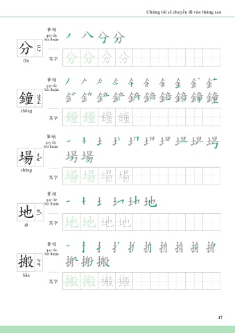 Chúng tôi sẽ chuyển đi vào tháng sau 筆順 quy tắc bút thuận 分 fēn 寫字 分分 分 分 筆順 quy tắc bút thuận 鐘 zhōng 寫字 鐘鐘 鐘 鐘 筆順 quy tắc bút thuận 場 chǎng 寫字 場場 場 場 筆順 quy tắc bút thuận 地 dì 寫字 地地 地 地 筆順 quy tắc bút thuận 搬 bān 寫字 搬搬 搬 搬 47