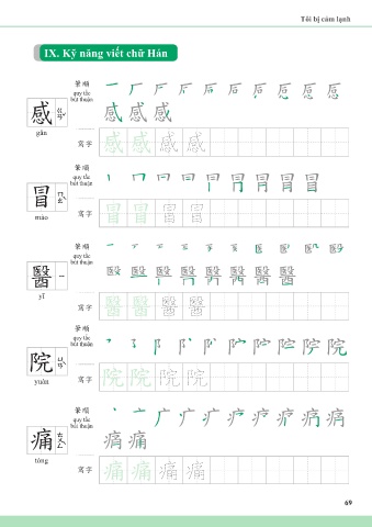 Tôi bị cảm lạnh IX. Kỹ năng viết chữ Hán 筆順 quy tắc bút thuận 感 gǎn 感感 感 感 寫字 筆順 quy tắc bút thuận 冒 mào 寫字 冒冒 冒 冒 筆順 quy tắc bút thuận 醫 yī 醫醫 醫 醫 寫字 筆順 quy tắc bút thuận 院 yuàn 寫字 院院 院 院 筆順 quy tắc bút thuận 痛 tòng 寫字 痛痛 痛 痛 69