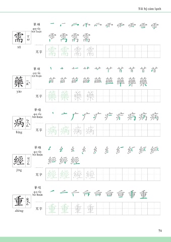 Tôi bị cảm lạnh 筆順 quy tắc bút thuận 需 xū 寫字 需需 需 需 筆順 quy tắc bút thuận 藥 yào 寫字 藥藥 藥 藥 筆順 quy tắc bút thuận 病 bìng 寫字 病病 病 病 筆順 quy tắc bút thuận 經 jīng 寫字 經經 經 經 筆順 quy tắc bút thuận 重 zhòng 寫字 重重 重 重 71
