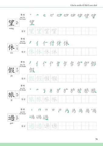 Gloria muốn đi Đài Loan chơi 筆順 quy tắc bút thuận 望 wàng 寫字 望望 望 望 筆順 quy tắc bút thuận 休 xiū 寫字 休休 休 休 筆順 quy tắc bút thuận 假 jià 假假 假 假 寫字 筆順 quy tắc bút thuận 旅 lǚ 寫字 旅旅 旅 旅 筆順 quy tắc bút thuận 過 guò 過過 過 過 寫字 79