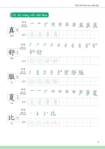 Thời tiết hôm nay thật đẹp IX. Kỹ năng viết chữ Hán 筆順 quy tắc bút thuận 真 zhēn 寫字 真真 真 真 筆順 quy tắc bút thuận 舒 shū 寫字 舒舒 舒 舒 筆順 quy tắc bút thuận 服 fú 寫字 服服 服 服 筆順 quy tắc bút thuận 夏 xià 寫字 夏夏 夏 夏 筆順 quy tắc bút thuận 比 bǐ 寫字 比比 比 比 5