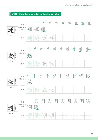 ¿Qué te gusta hacer normalmente? VIII. Escriba caracteres tradicionales അන orden de los ༶ 運 trazos yùn ᄳο ༶ ༶ 運 運 അන orden de los ਗ 動 trazos dòng ᄳο ਗ ਗ 動 動 അන orden de los ਂ 作 trazos zuò ᄳο ਂ ਂ 做 做 അන orden de los 週 trazos zhōu ᄳο 週 週 39