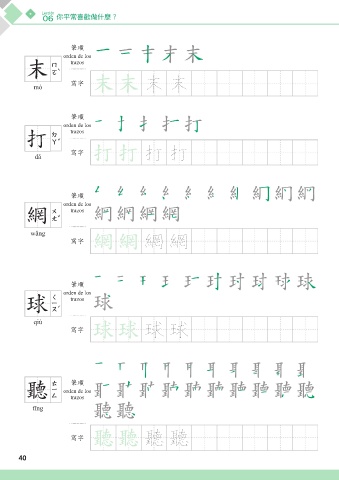 Lección 06 你平常喜歡做什麼? അන orden de los ͋ 末 trazos mò ᄳο ͋ ͋ 末 末 അන orden de los ͂ 打 trazos dǎ ᄳο ͂ ͂ 打 打 അන orden de los ၣ 網 trazos wǎng ᄳο ၣ ၣ 網 網 അන orden de los ଢ 球 trazos qiú ᄳο ଢ ଢ 球 球 ᛓ 聽 orden de los അන trazos tīng ᛓ ᛓ 聽 聽 ᄳο 40