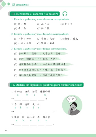 1. Escuche la grabación y rodee el carácter correspondiente.
